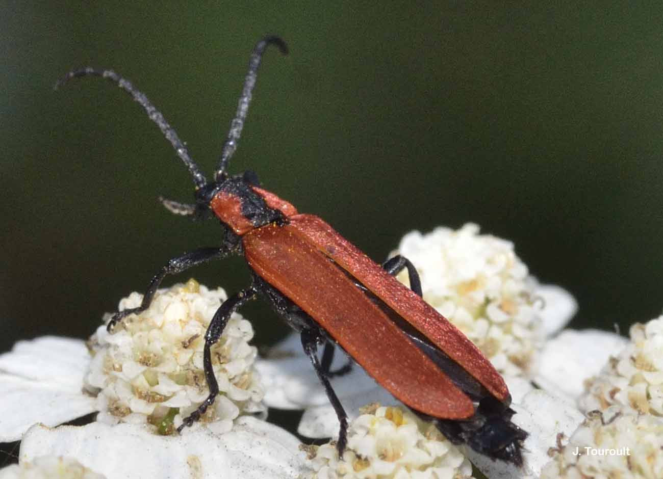Corps allongé, peu convexe, entièrement rougeâtre avec la tête, le disque du pronotum, les appendices et le scutellum noirs. Elytres couverts d’une fine pubescence rouge soyeuse qui masque la fine ponctuation. Les antennes sont épaisses, toutes noires et atteignent le premier quart des élytres. Le pronotum est nettement transverse, à côtés quasi-rectilignes, avec 2 vagues nervures transversales.
