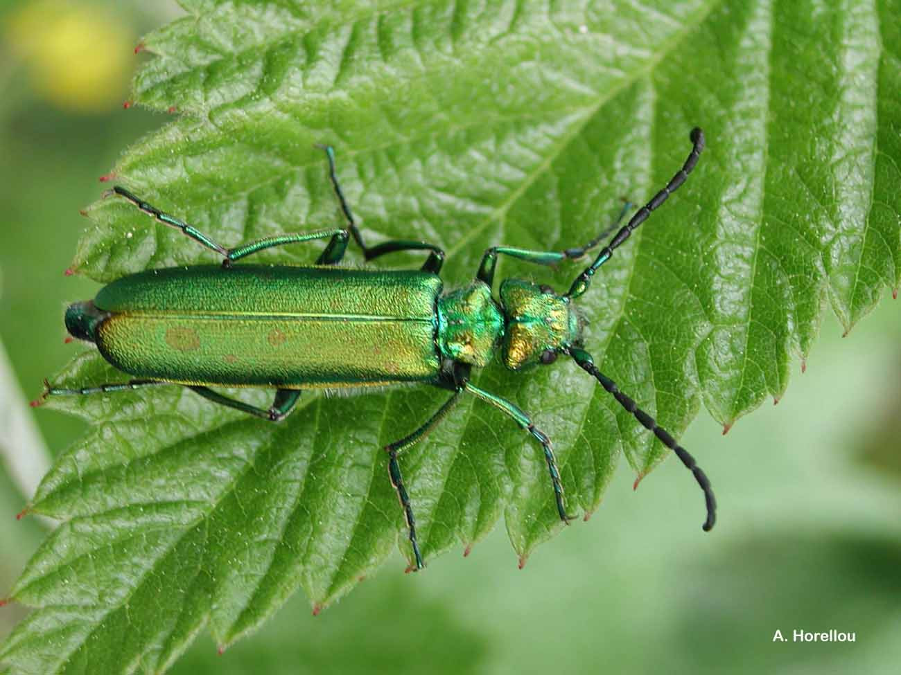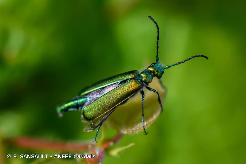 Corps allongé en entier vert métallique plus ou moins doré brillant, les élytres d’aspect soyeux. Tête très transverse, pronotum trapézoïdal, antennes longues dépassant un peu la base des élytres. Avant-corps à pubescence blanche fine peu visible, le reste glabre.