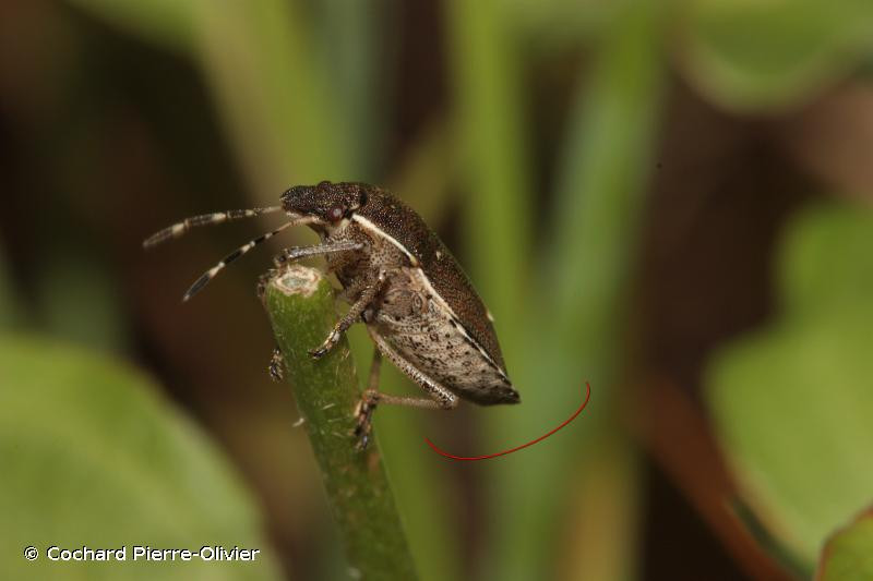 Taille : 8 – 10 mm Diagnose : Petite punaise de coloration globale violacée homogène. Son clypéus (nez) est non enclos par les jugas (joues). Les articles antennaires III sont aussi longs que les II, et les III, IV, V sont jaunes avec chacun un anneau noir. L’extrémité du scutellum est blanche et contrastée par rapport au reste du corps avec son bord antérieur marqué de petits points blancs (ou calus). Bords antéro‐latéraux du pronotum finement rebordés, avec un ourlet mince portant une carène médiane lamellaire (vue de face). Détermination : Délicate. Espèces proches : Se distingue d’H. albipes qui a les bords antéro-latéraux du pronotum larges et calleux, sans rebord caréné. Proche d'Holcostethus evae : l’examen des pièces génitales mâles (pygophore) est nécessaire pour une identification sûre en région méditerranéenne : il est nettement échancré en forme de V chez H. evae, et beaucoup moins chez H. sphacelatus. Période d’observation : Avril à octobre, avec un pic en juin-juillet. Biologie-éthologie : C’est une espèce polyphage, qui s’alimente le plus souvent sur molènes (Scrophulariacées), résédas (Résédacées), centranthes (Caprifoliacées), achillées (Asteracées) ou airelles (Ericacées). Biogéographie et écologie : Espèce répandue dans toute l’Europe, sauf en Grande-Bretagne et dans les péninsules Danoise et Scandinave, jusqu’à 55° de latitude nord. Absente des secteurs méditerranéens les plus chauds, elle atteint 1 850 m d’altitude. On la trouve en milieux ouverts et ensoleillés : friches, lisières forestières, landes, pelouses et prairies, affleurements rocheux. Commune dans toute son aire, mais sa densité est rarement élevée. On peut la trouver en présence d’H. albipes en zone méditerranéenne, et d’H. evae dans l’est des Pyrénées.