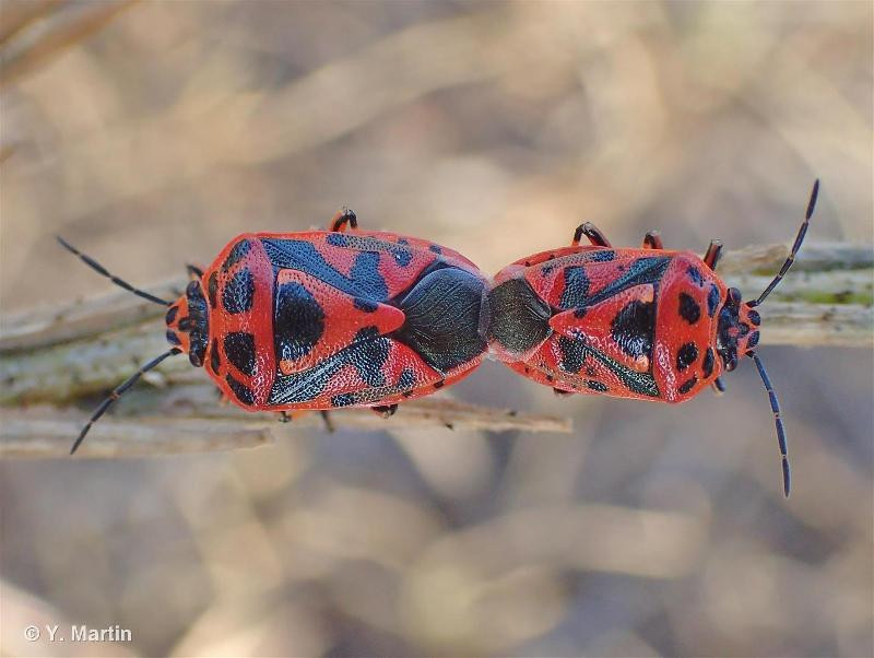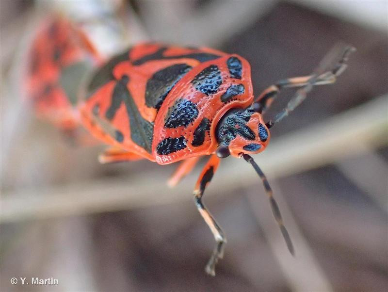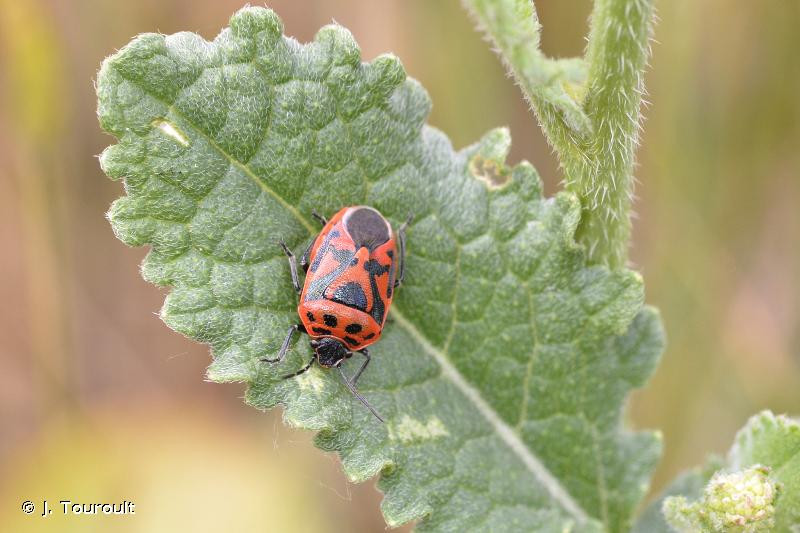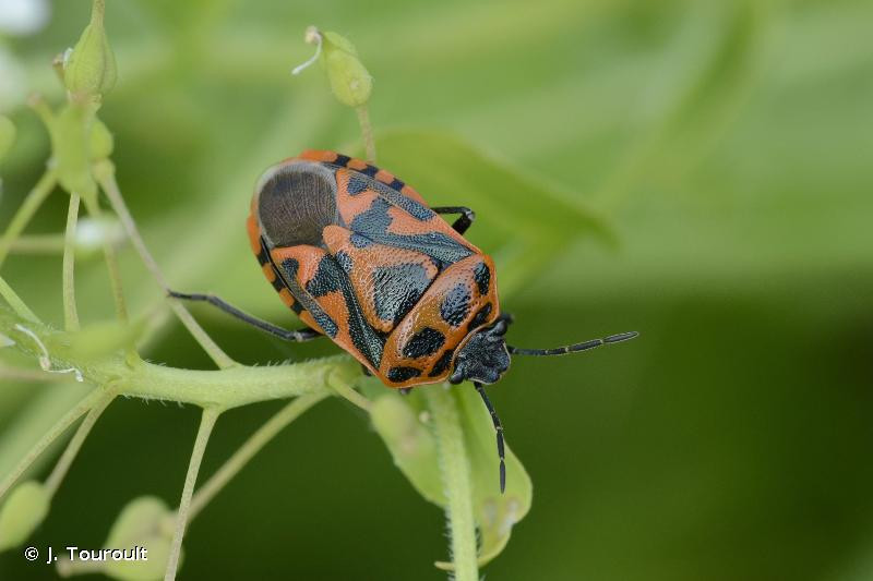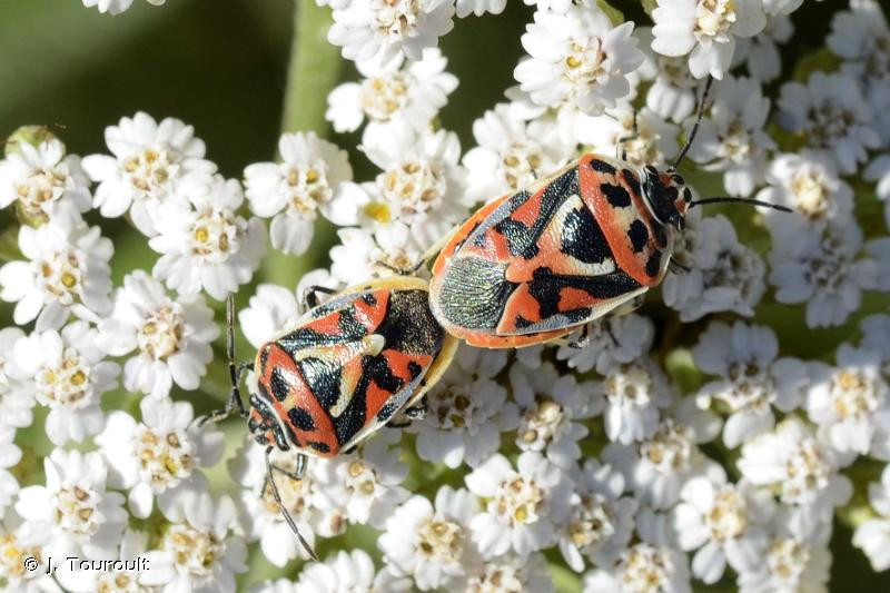 Punaise de coloration générale noire à reflets métalliques, bariolée de taches claires rouges, orange ou blanches. Corie (partie sclérifiée de l’aile antérieure) dont la partie centrale (mésocorie) porte au moins 2 grandes taches claires, et dont la partie externe latérale (exocorie) porte une tache noire en son milieu, et souvent une zone sombre délavée en arrière de cette tache. Scutellum avec une tache claire principale en forme de Y.