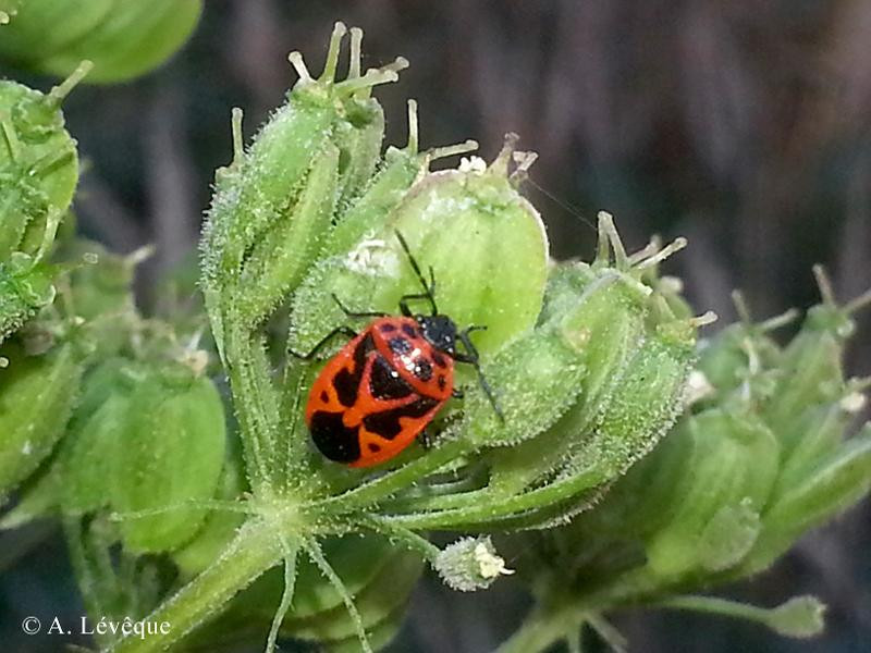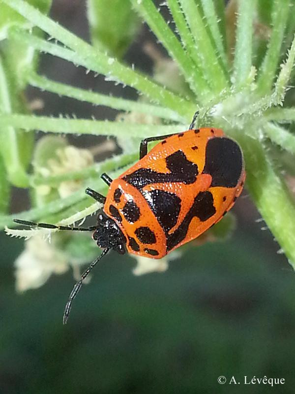 Taille : 5 – 7,5 mm Diagnose : Petite punaise de coloration générale noire à reflets métalliques, bariolée de taches claires rouges ou orange. Corie (partie sclérifiée de l’aile antérieure) dont la partie centrale (mésocorie) porte au moins 2 grandes taches claires, et dont la partie externe latérale (exocorie) est entièrement claire sans tache noire. Scutellum avec une tache claire principale en forme de Y. Détermination : Simple. Espèces proches : Au sein du genre Eurydema, cette espèce se reconnaît à l’absence de tache noire sur l’exocorie, à ses hémélytres luisants et à sa petite taille. Période d’observation : Avril à septembre. Biologie-éthologie : Elle se nourrit sur plusieurs crucifères dont principalement les arabettes, les cardamines et les rorripes. Biogéographie et écologie : Espèce paléarctique présente dans le sud de la Grande-Bretagne et de la Scandinavie jusqu'à 60° de latitude nord. Elle atteint l'Inde, la Corée et le Japon vers l’est, et la limite septentrionale du domaine méditerranéen vers le sud. Elle est répandue dans les plaines du nord et de l’est soumises au climat continental. Elle évite les zones montagneuses et les façades maritimes de la Méditerranée, de l’Atlantique, de la Manche et de la mer du Nord. On la rencontre principalement dans les milieux humides des secteurs continentaux : prairies humides tempérées, marais, tourbières, landes à bruyères, lisières forestières, parcs, et parfois, plus au nord, sur pelouses calcicoles ensoleillées. C’est une espèce relativement rare, dont la densité est toujours faible.