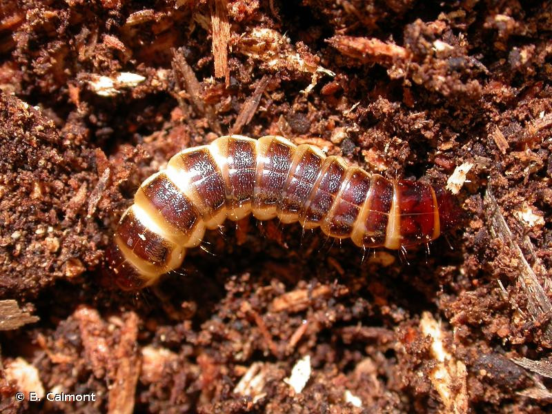 La larve est filiforme et cylindrique (de type "ver fil-de-fer"), noire dorsalement et pâle ventralement, le dernier segment orné de deux dents.