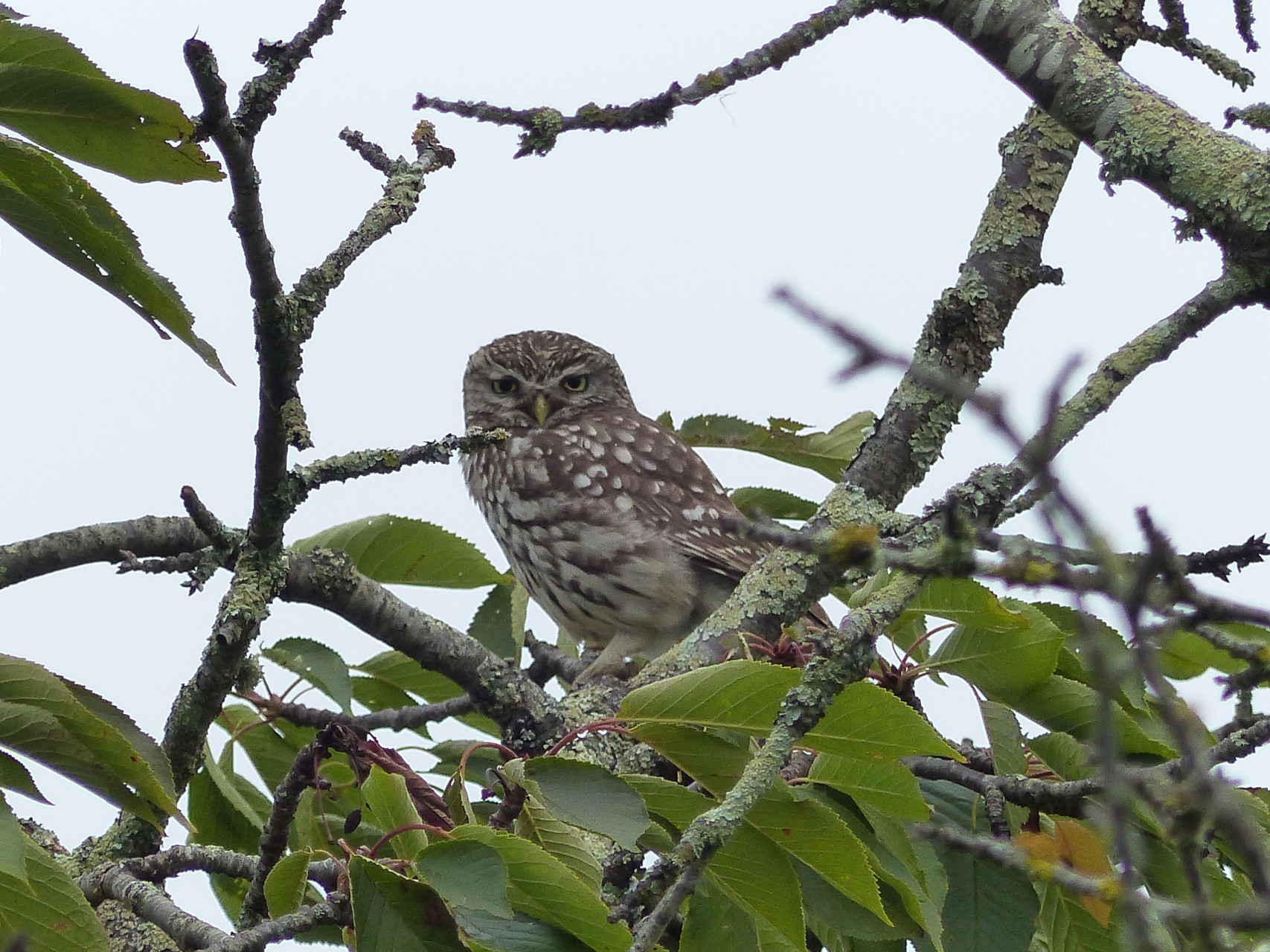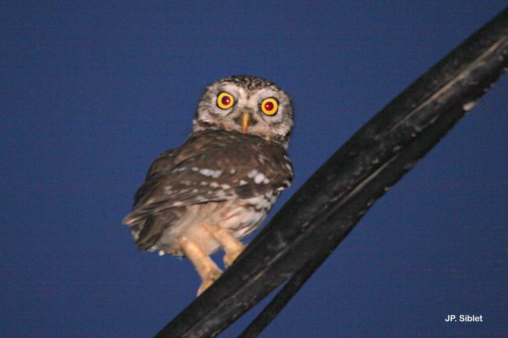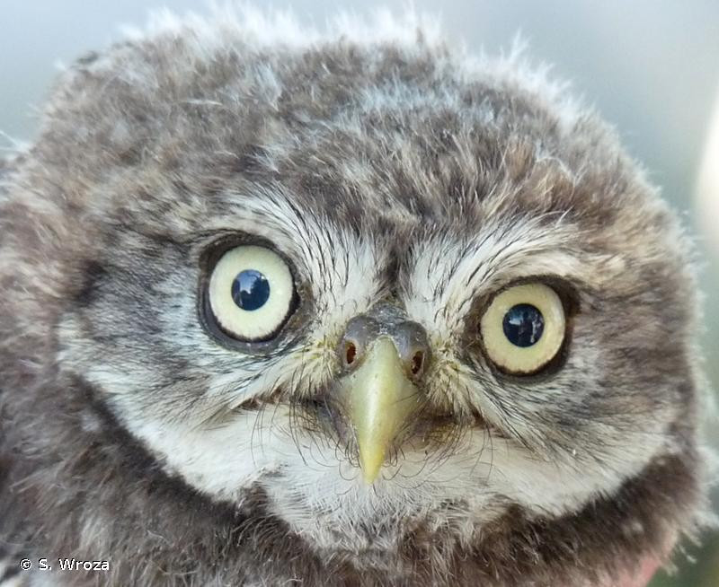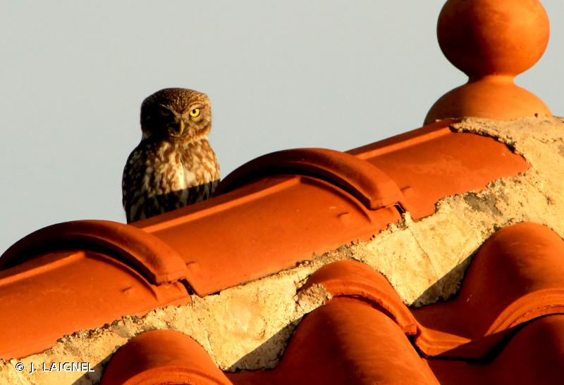 La Chouette chevêche possède un plumage brun terre sur le dessus et le dessous est blanc jaunâtre avec de larges rayures brunes, assez serrées sur la poitrine. Les pattes sont couvertes de plumes blanchâtres et les doigts parsemés de plumes filiformes. La calotte est tachetée de multiples petits points blancs et les épaules sont constellées de grosses tâches blanches.