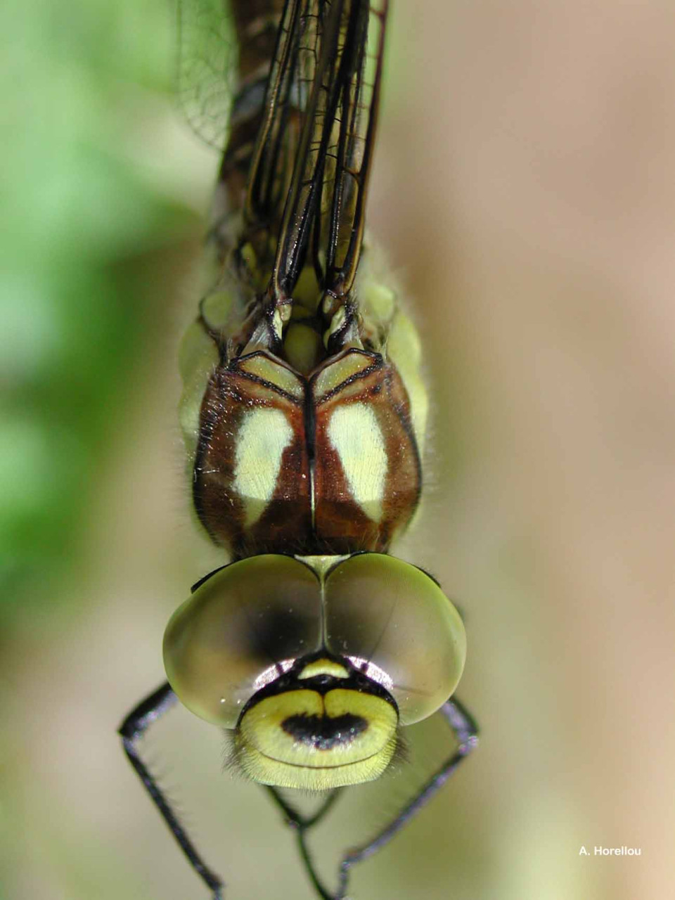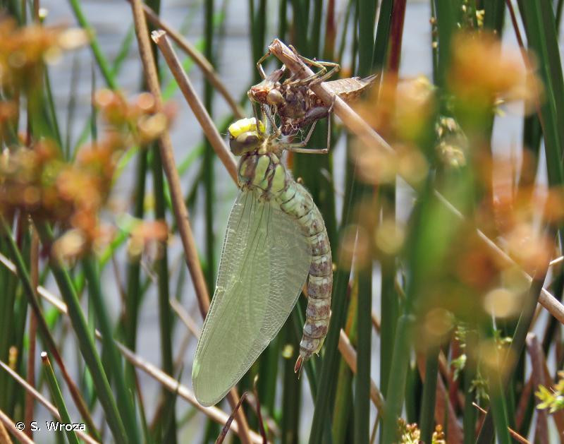 C'est une grande libellule au corps sombre, orné de marques vert pomme, et bleues ciel sur l’abdomen des mâles.